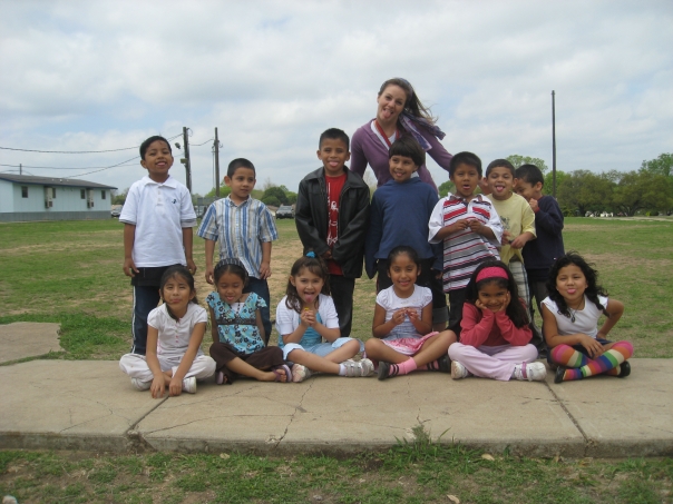 Group of thriteen young boys and girls with a teacher having fun sticking out their tongues!