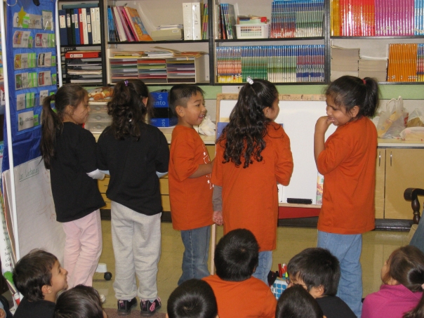 Several children, most of whom are wearing orange or black shirts, are together in a classroom.
