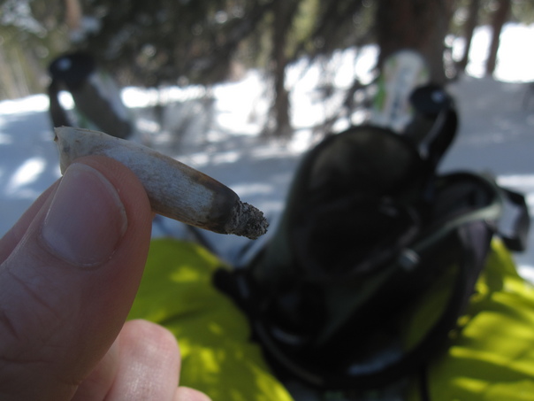 A rolled cigarette is seen being held by two fingers and is half-way smoked.