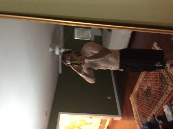 A man's mirror view , he is wearing black pant and bear body looking into small object in his hand
