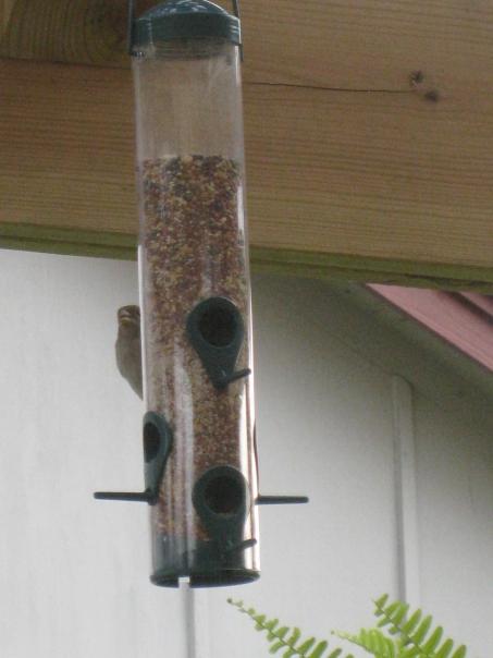 I snapped a few pictures of the birds using the elongated bird feeder that I set up under the pergola of Prairie Knoll. They made a complete mess of the thing.