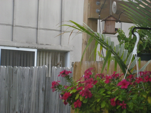 I snapped a few pictures of the birds using the elongated bird feeder that I set up under the pergola of Prairie Knoll. They made a complete mess of the thing.