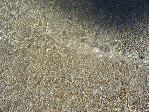 Rippling water reflects sunlight over a shallow bed of small brown rocks.