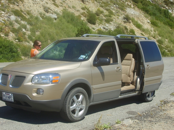 A woman stands next to a gold-brown minivan parked on a paved road along a hillside.