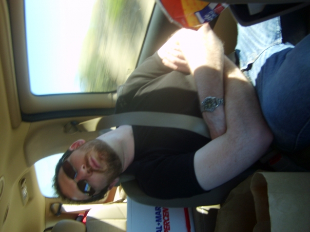 A bearded man is sleeping in a van, he is wearing dark sunglasses and a dark shirt.