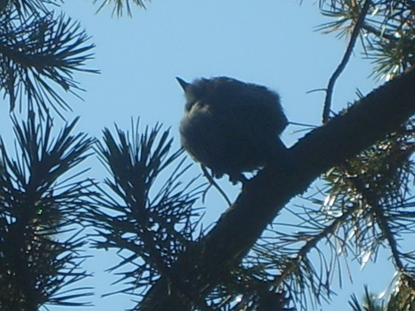 A fluffy feathered bird perched high on an evergreen tree branch....