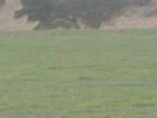 Open green field, slightly out of focus, but there is a vertical object just to the left of center, and a large tree in the background.