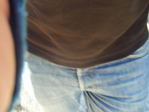 The torso of a person wearing a chocolate brown shirt and faded blue jeans.