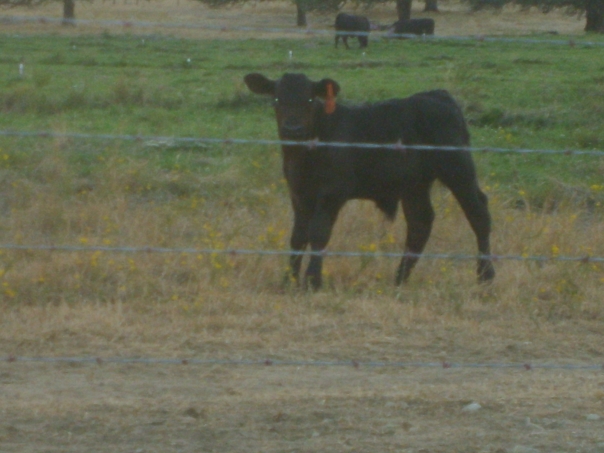 There is a small, black, baby calf standing in a field behind a barbed wire fence staring at the person taking the picture.