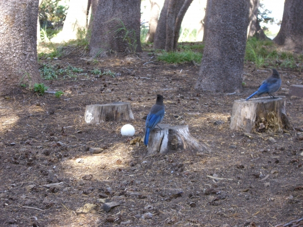 Two bright blue birds standing on tree stumps in a forest floor covered with pine cones.