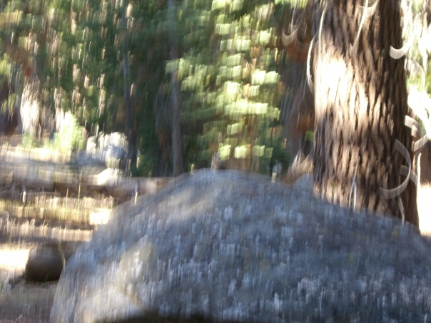 An accidental snapshot of a rock with trees in the background.