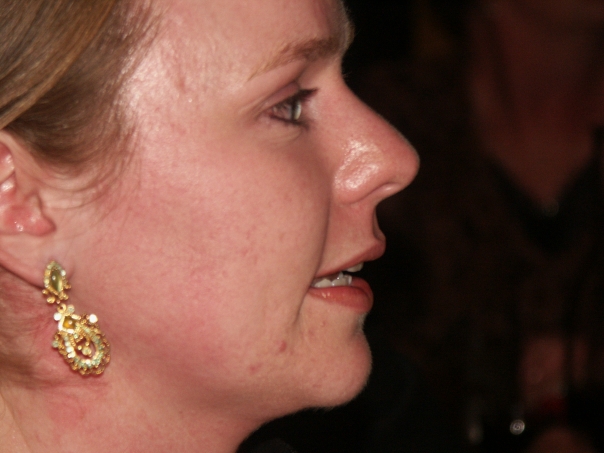 a woman is crying seemingly wearing golden earrings and facing sideways