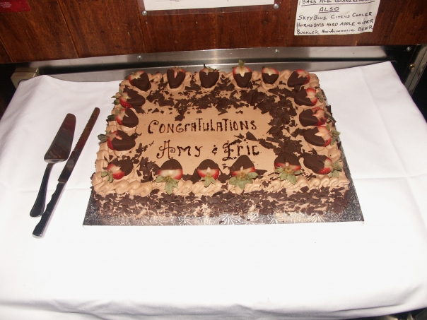 A chocolate sheet cake with strawberries on it saying congratulations to two people.