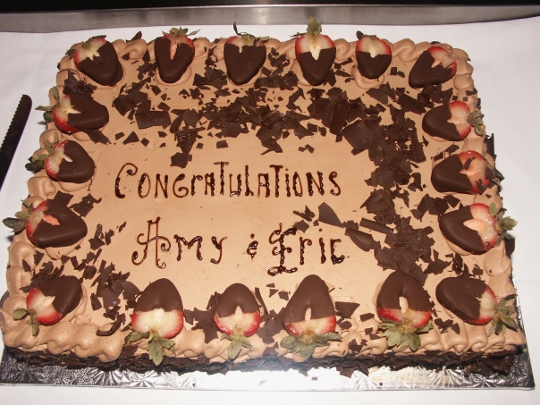 A delicious chocolate frosted cake with the words, "Congratulations Amy & Eric on top.