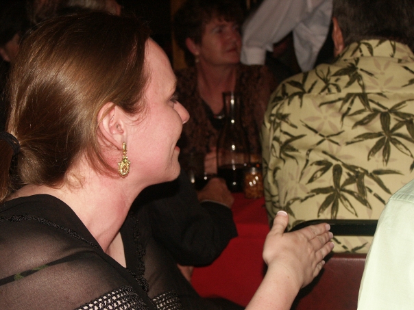 woman with earring looking on at a party in a restaurant full of people
