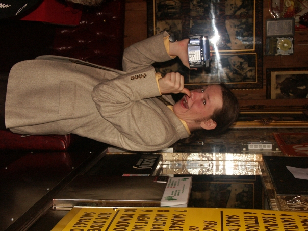 A man in a tan sports coat holds up a video camera, standing in front of a red leather booth at an Italian restaurant.