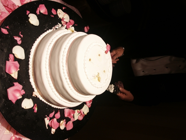 Simple white wedding cake with light pink rose petals around it.