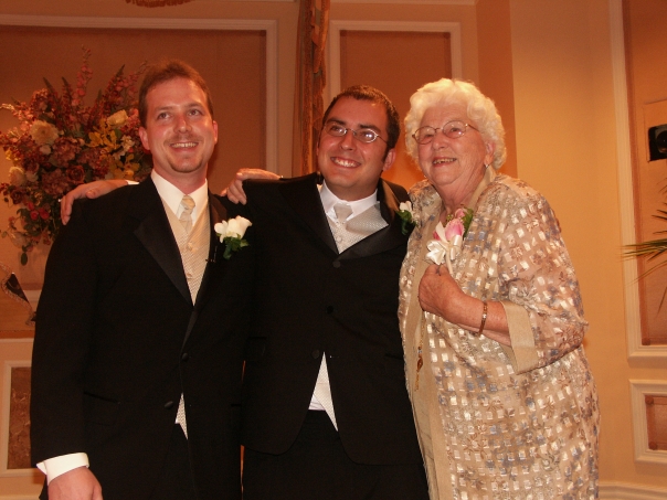 Two men and an older woman stand together in a picture of what appears to be a wedding as they are very dressed up in suits, and two of them have flower boutonniere's.