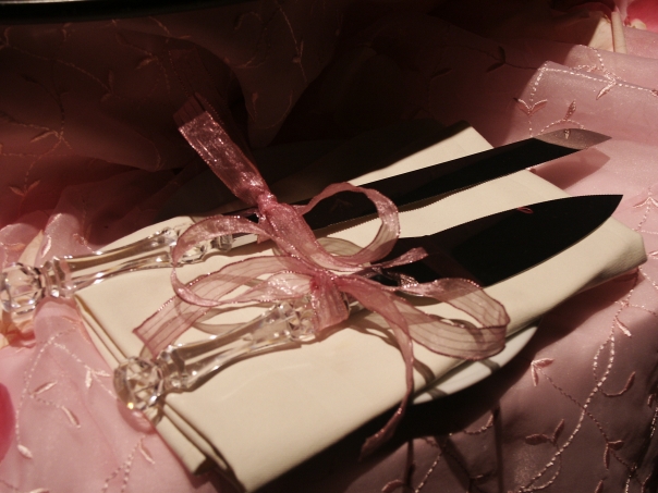 The is a picture of a set of silverware with glass handles that is wrapped in a pink ribbon, sitting upon a light pink napkin on top of a pink tablecloth.