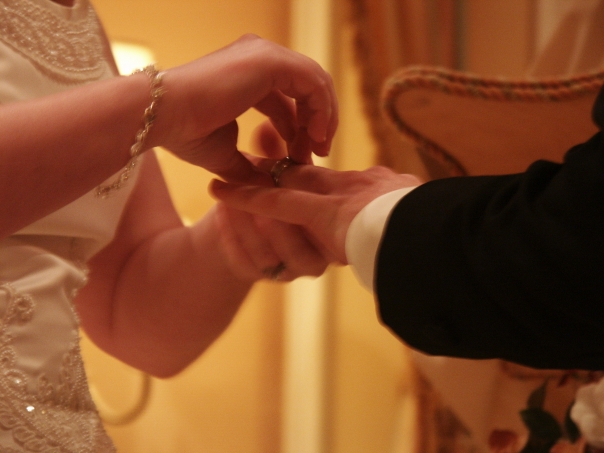 A bride in a beaded dress is slipping the wedding band onto her husband at their wedding ceremony.