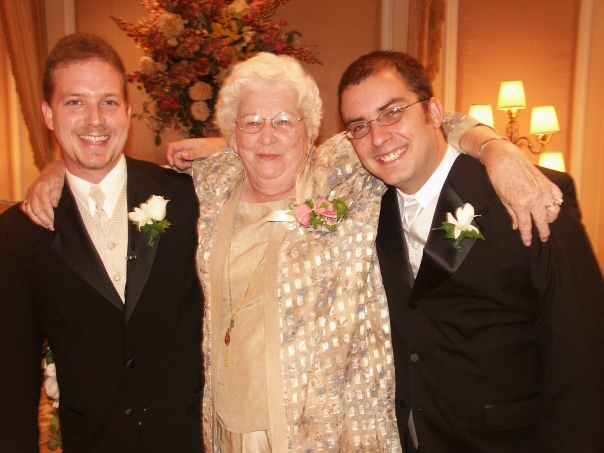 An older woman in a metallic taupe outfit wraps her arms around two adult males in black tuxedos.