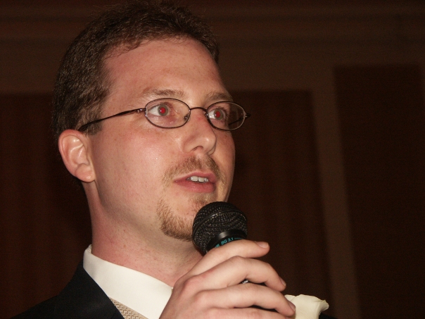A young man with a goatee wearing wire rimmed glasses holding a microphone.