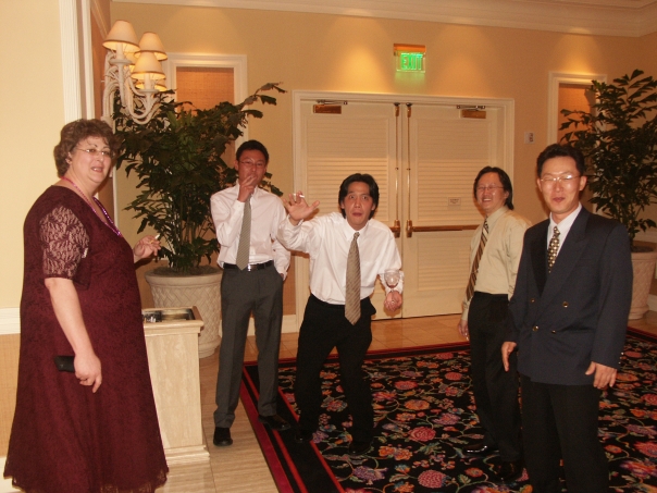 Four gentlemen and a lady taking a cigarette break at an event