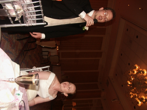 A member of the wedding makes a speech while a happy bride looks on.