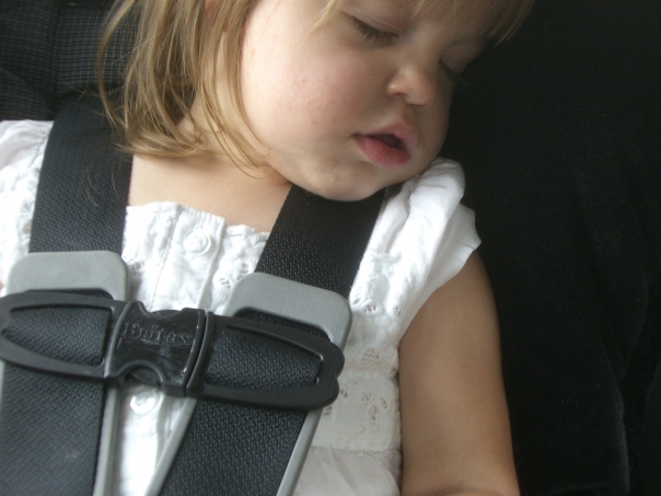 A baby girl with blond hair and a white shirt is asleep while buckled into a car seat.