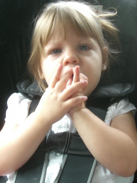 A beautiful girl baby is sucking her fingers. She is wearing seat belt.