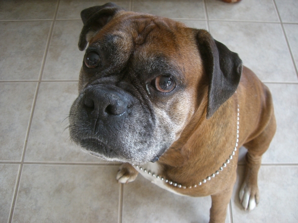 A cute wrinkly faced dog wearing a string of pearls sitting on a tiled floor