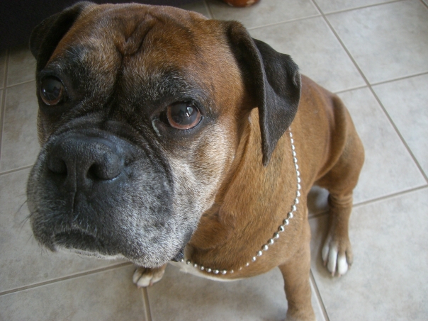 A brown white and black bulldog with a necklace around its neck is looking at the camera