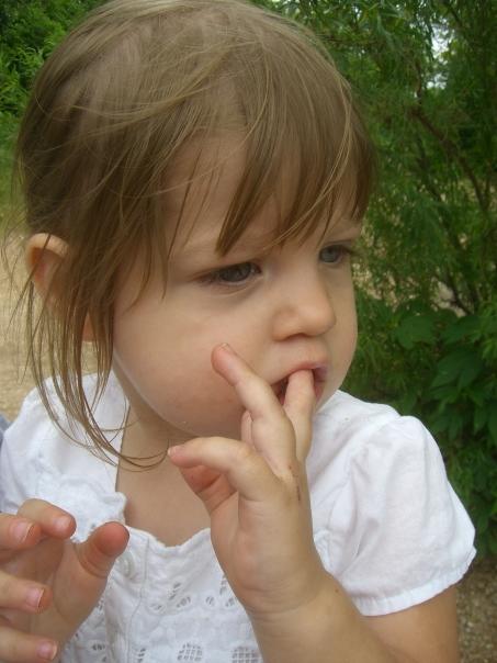 A little girl with fingers in her mouth stares curiously at something in the distance.