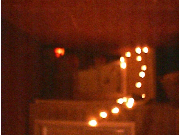 a very poorly focused photo that shows multiple light sources in a dark room