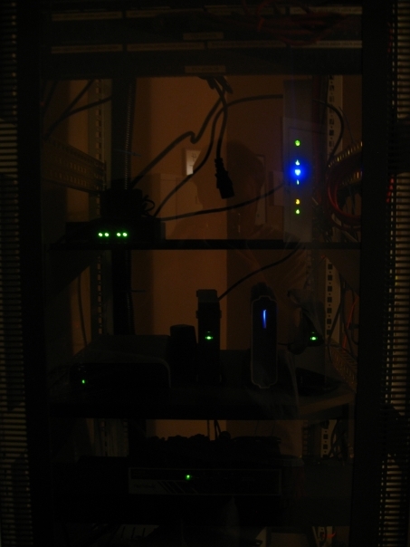 There are a bunch of pictures that I took in the dark just so that all of the blinking lights would show up. The others just highlight my basic server setup. The glass desk to the front and right of the room is my electronics workshop. There are just a bunch of electronic boards on it, a soldering iron, and a swinging magnifying glass.