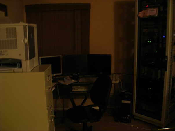 There are a bunch of pictures that I took in the dark just so that all of the blinking lights would show up. The others just highlight my basic server setup. The glass desk to the front and right of the room is my electronics workshop. There are just a bunch of electronic boards on it, a soldering iron, and a swinging magnifying glass.