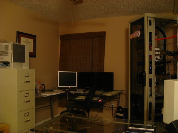 There are a bunch of pictures that I took in the dark just so that all of the blinking lights would show up. The others just highlight my basic server setup. The glass desk to the front and right of the room is my electronics workshop. There are just a bunch of electronic boards on it, a soldering iron, and a swinging magnifying glass.