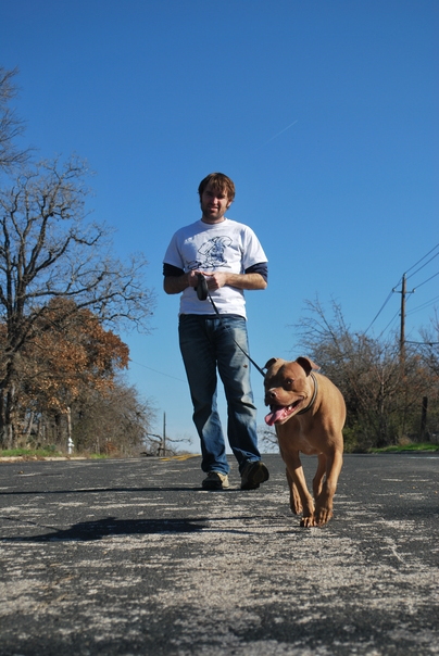 the man is taking the dog for the walk in the road side |