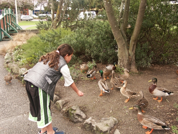 There is a young girl wearing a silver vest and brown and green capri length pants who is feeding a group of ducks.