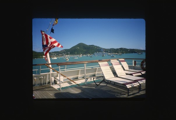 The flag is red, white, and blue in color and is on the boat with lounge chairs.