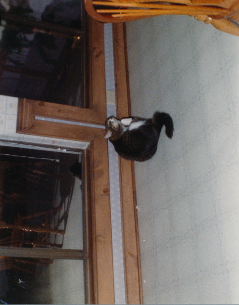 This is an indoor kitchen scene depicting a cat on the floor scratching himself with his hind leg. |