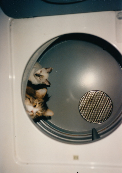There are two young cats that are looking out from the inside of a dryer that was turned off.