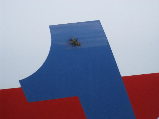 This is a fly resting on a smooth red white and blue surface. |
