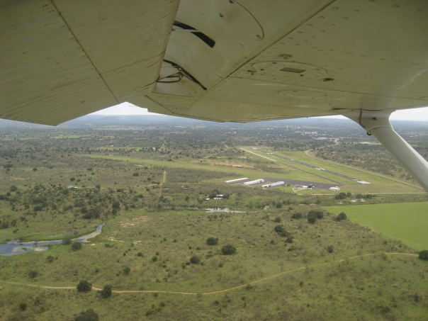 This photo overlooking the landscape was taken from the open cockpit of a small plane. |