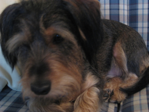 A brown and black dog with long hair on his nose and eyebrows sits for a picture on a plaid patterned couch. |