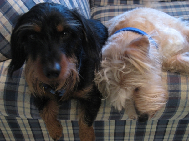 Two adorable puppies lying on a couch, while one of them fast asleep. |