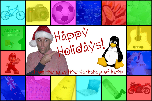 Sixteen boxes of different colors and different pictures inside and in the center a man wishing Happy Holidays