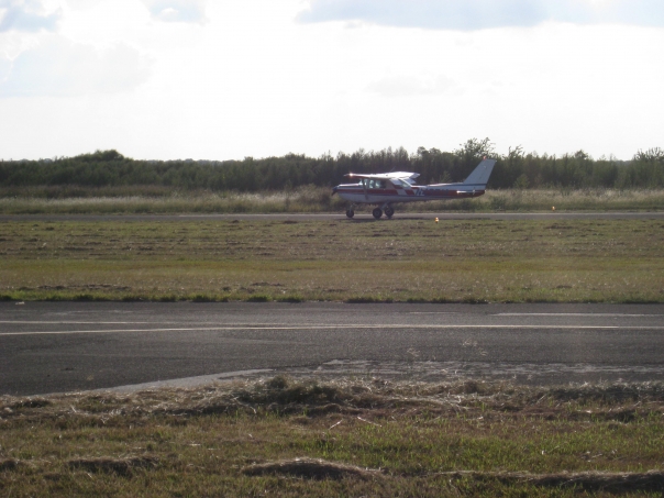 Image of a small red and white airplane rolling into a landing on an isolated landing strip later in the day.