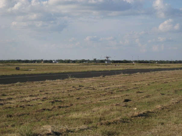 This is a runway or road in the middle of a grassy area and a blue sky with fluffy clouds.