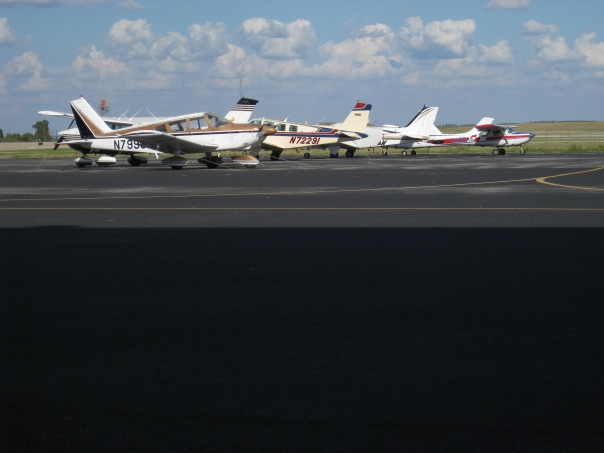 Private airplanes resting on a very quiet runway awaiting their pilots |